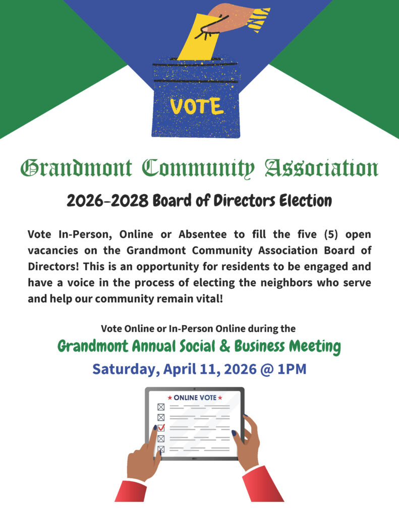 Vote In-Person, Online or Absentee to fill the five (5) open vacancies on the Grandmont Community Association Board of Directors! This is an opportunity for residents to be engaged and have a voice in the process of electing the neighbors who serve and help our community remain vital! Vote Online or In-Person Online during the Grandmont Annual Social & Business Meeting Saturday, April 11, 2026 @ 1PM. To register to vote Online, Absentee, or In-Person, please use the registration form hyperlink https://forms.gle/5cAyjy3fypjXdagt5. Completing the registration form provides early access to online voting which begins on Wednesday, April 8, 2026.